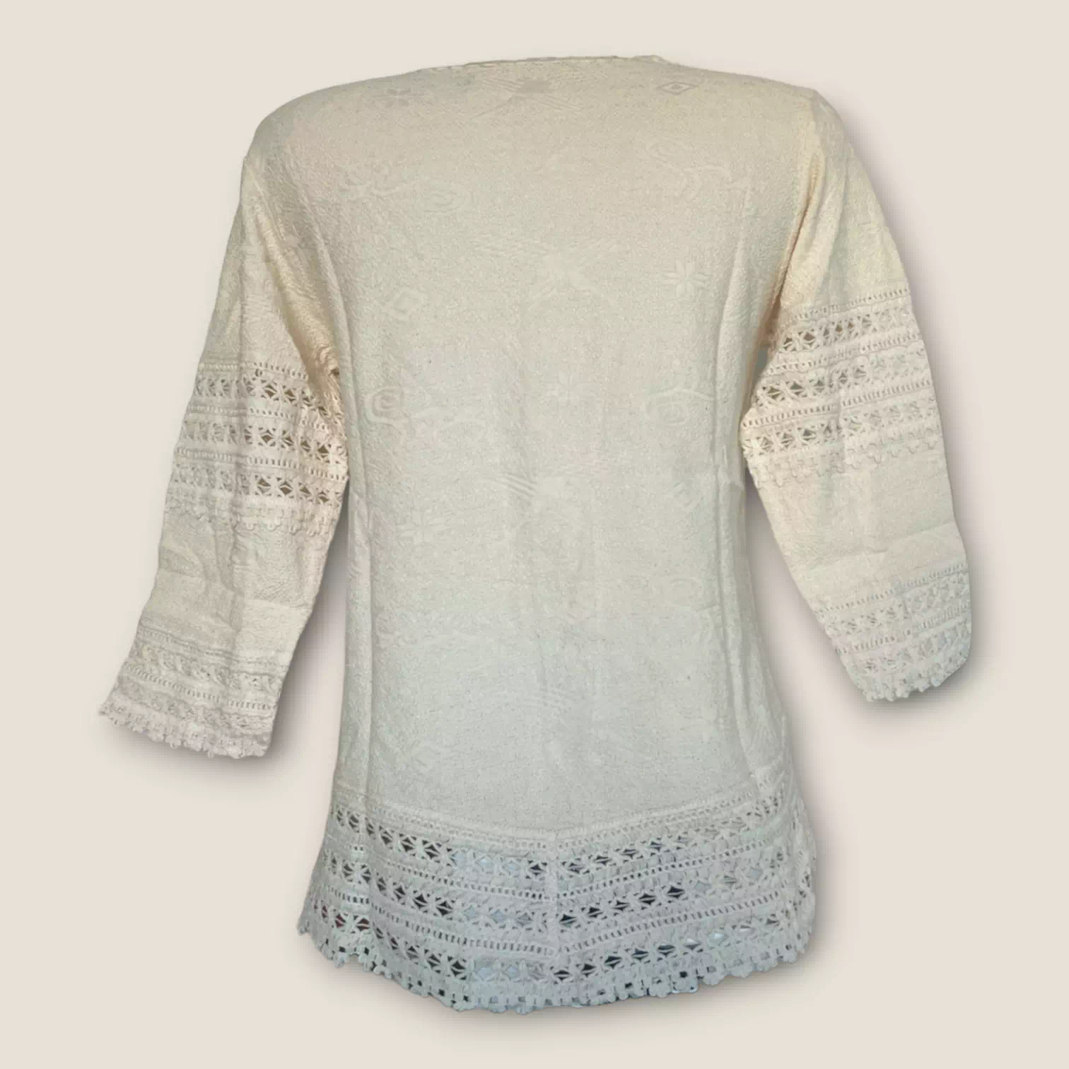 Haut 100% coton naturel – Alpamayo. Très beau travail réalisé à la main par une famille dans les ateliers à Lima. Coton bio du Pérou (Tangüis).